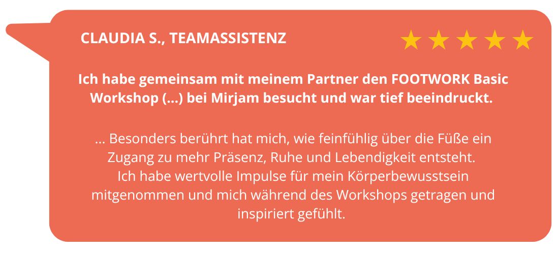 Footwork liebe ich bis heute – so sehr, dass ich es nicht nur in meiner Praxis anwende, sondern auch privat: bei meinen Liebsten auf dem Sofa oder bei mir selbst nach einem langen, anstrengenden Tag. Schon während meiner eigenen Ausbildung konnte ich mir dank Footwork das erste Jahr finanzieren, weil ich von Anfang mithilfe von Footwork Menschen ein Stück ihres Weges zu mehr Achtsamkeit für sich und ihren Körper begleiten durfte.