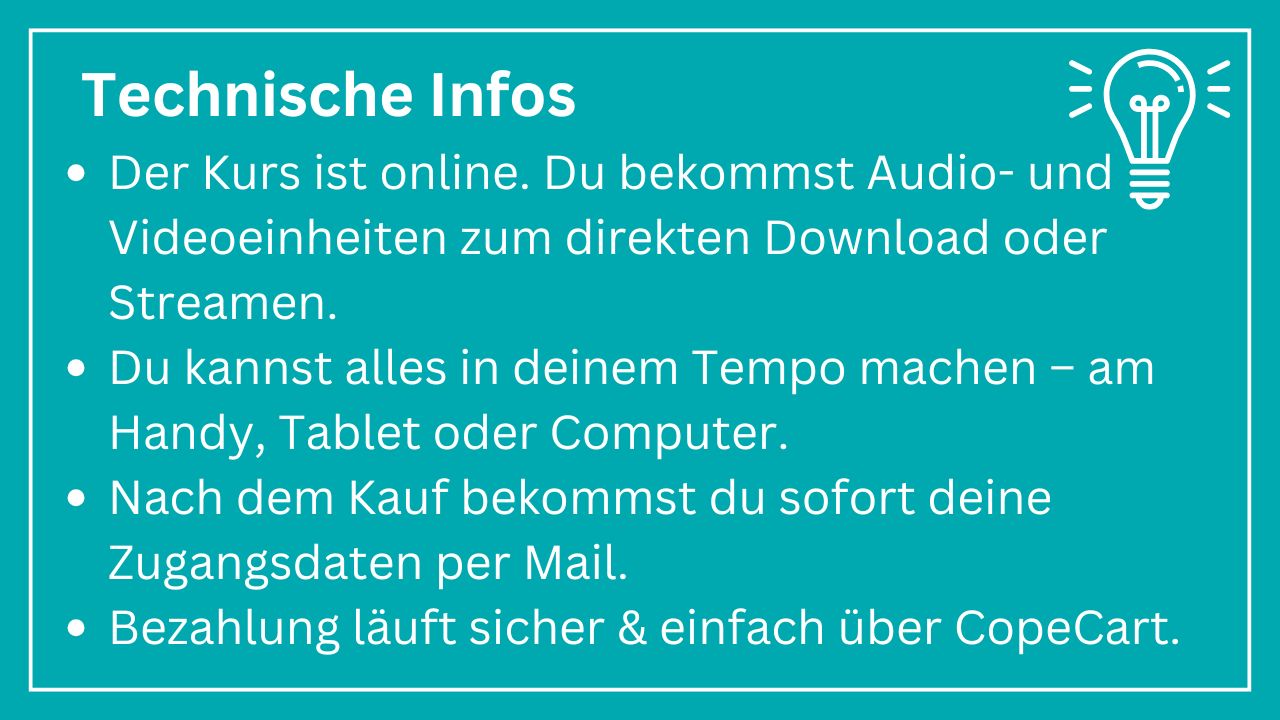 Du bekommst sofort nach dem Kauf Zugang zu allen Audios und PDFs. Du kannst also gleich loslegen – oder dir bewusst einen Starttag setzen. Ab dann begleiten dich für 21 Tage kleine Impulse die du täglich in deinem Email-Postfach findest.